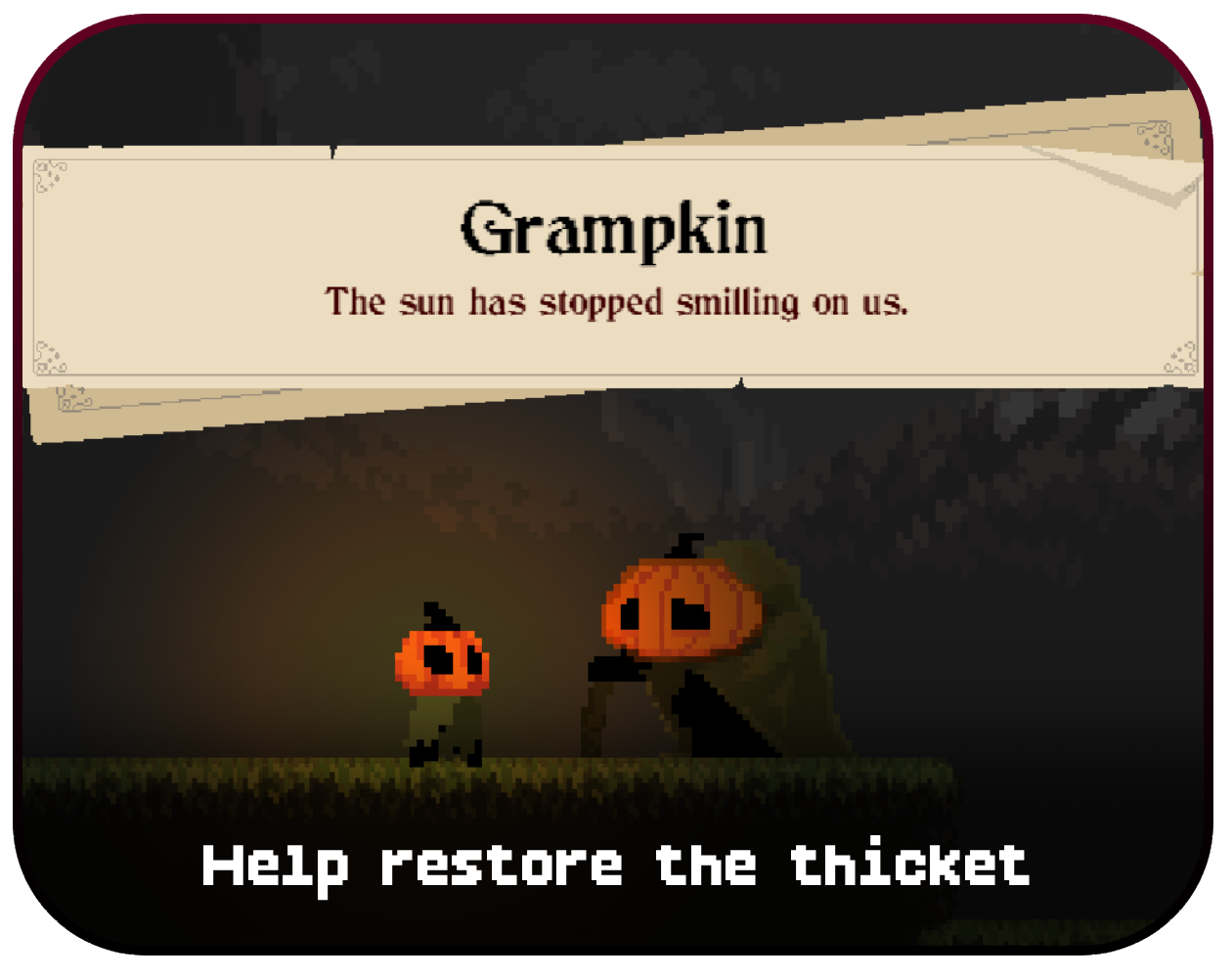 Theme usage: The game is centered around a forest where plants have been affected by the disappearance of the sun. The player controls a pumpkin character, representing plant life, and explores the environment to restore light by making the sun rise again.